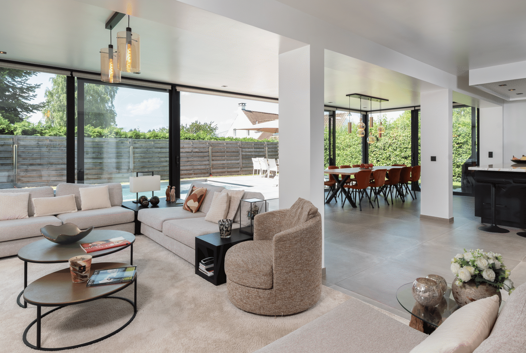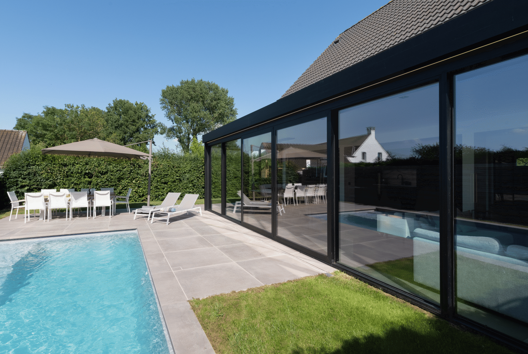 Annexe véranda moderne avec grande porte coulissante double, éclairage intégré et stores enrouleurs à Glimes, Incourt, dans le Brabant Wallon. Cette extension de maison offre aux occupants une salle à manger baignée de lumière et un vaste coin salon avec poêle à bois. Le soir, il est agréable de profiter de la piscine grâce à l’éclairage extérieur intégré. Vous rêvez vous aussi d’une véranda extension, d’une véranda classique ou d’un pool house en aluminium ? Découvrez nos réalisations, visitez notre showroom ou contactez-nous pour plus d’informations.