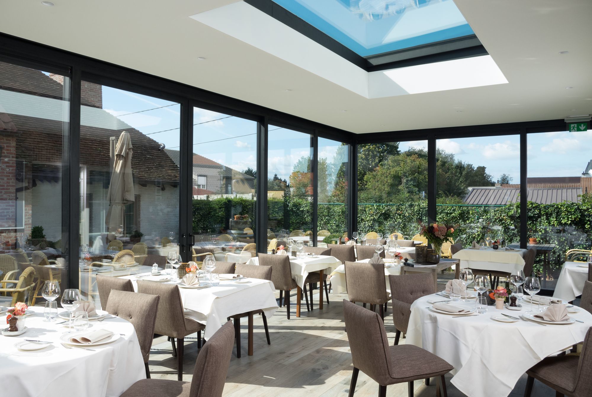 Een antraciete horeca veranda met grote, dubbele schuifdeur, ingewerkte verlichting, lichtstraat en zwarte zonnescreens voor restaurant La Maison Du Terroir in Oudenburg. Ga zeker eens langs voor verfijnde Frans-Belgische gastronomie met Terroir producten uit eigen streek! Ontdek meer van onze horeca veranda realisaties, kom langs in onze showroom of contacteer ons.