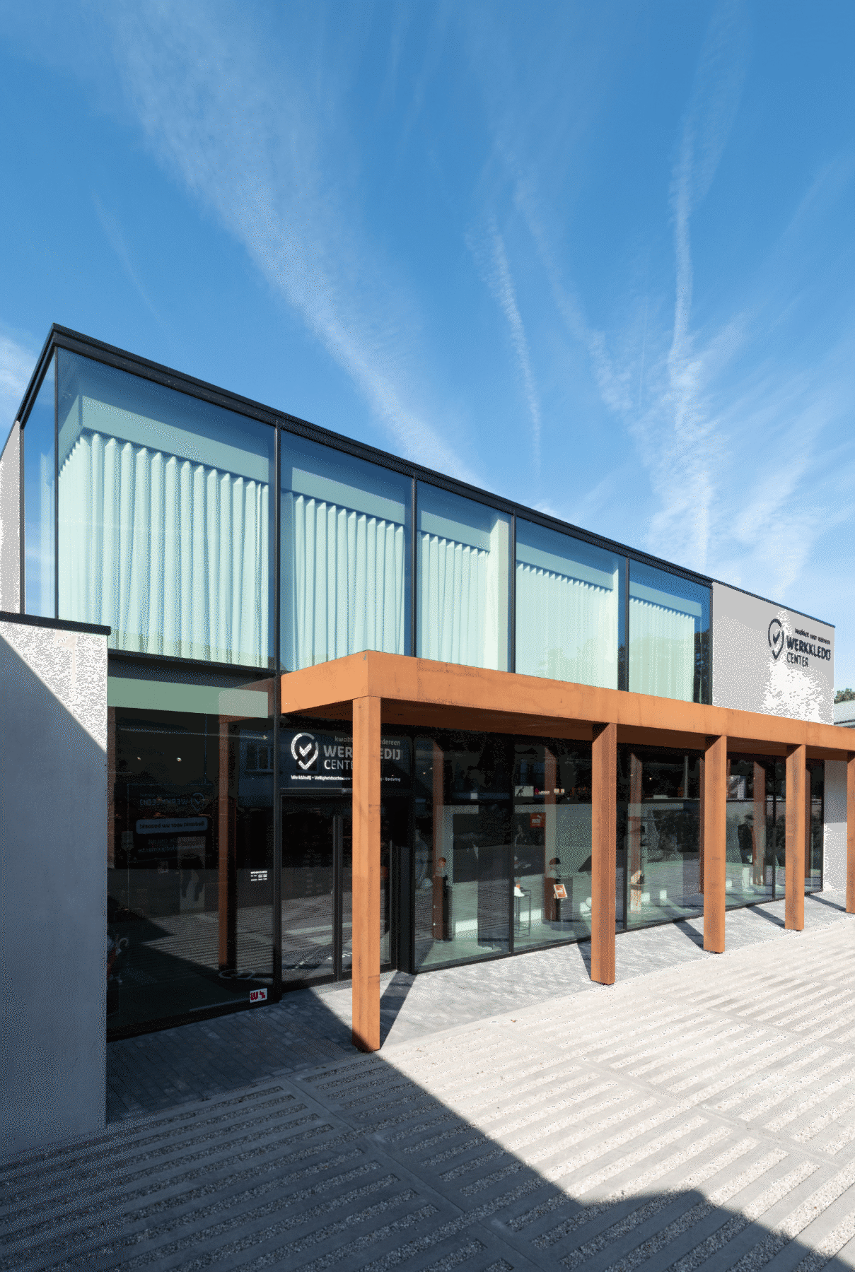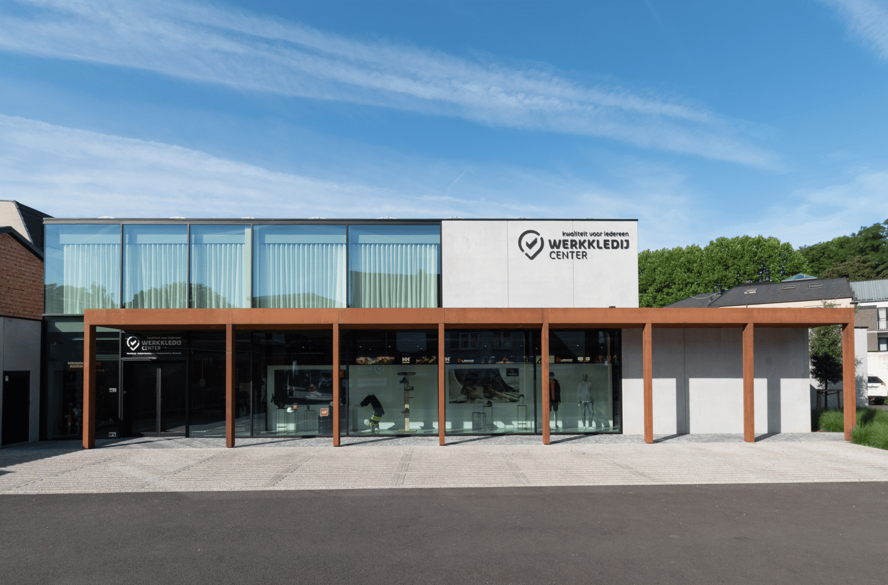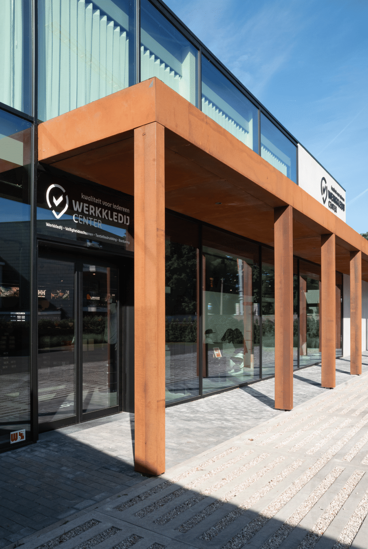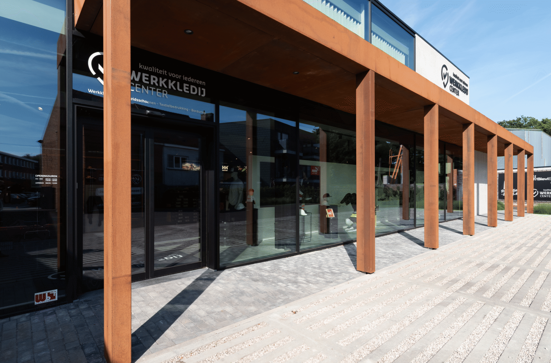 Moderne veranda en ramen met zwarte screens voor bedrijf Werkkledij Center in Waregem.