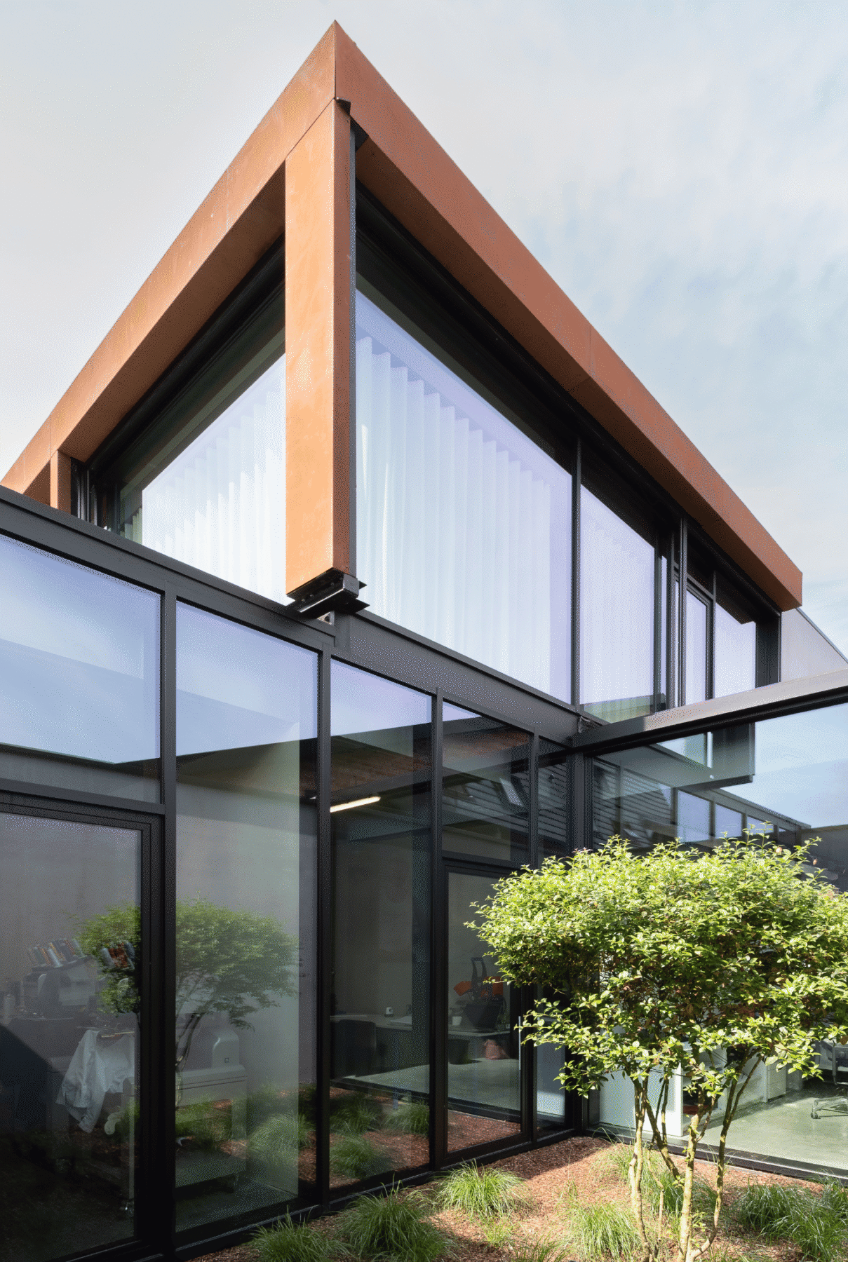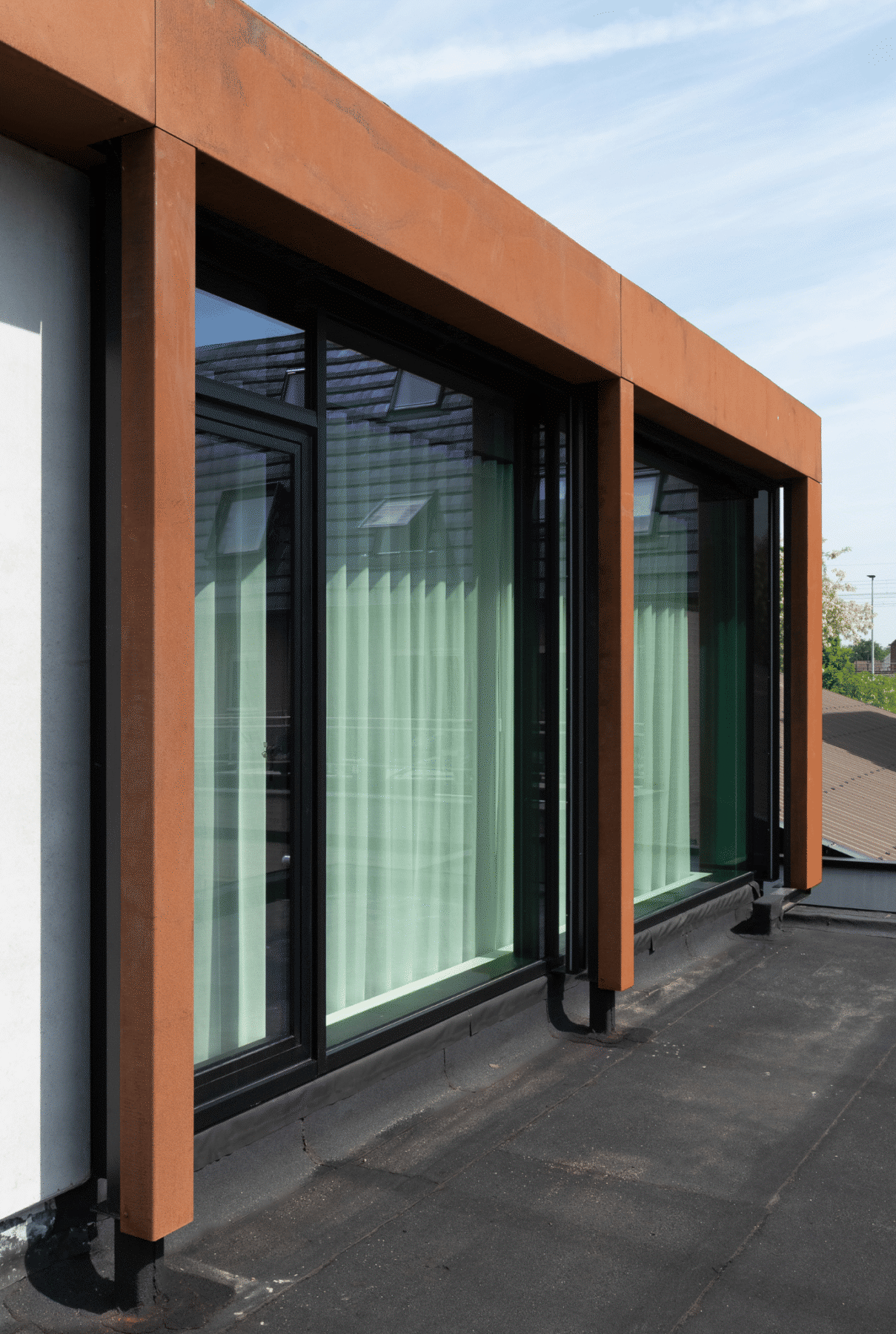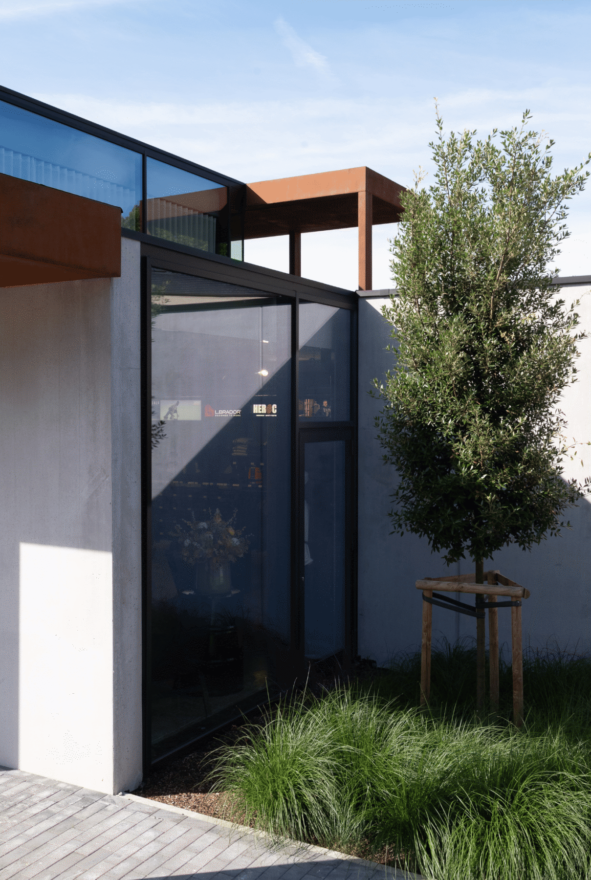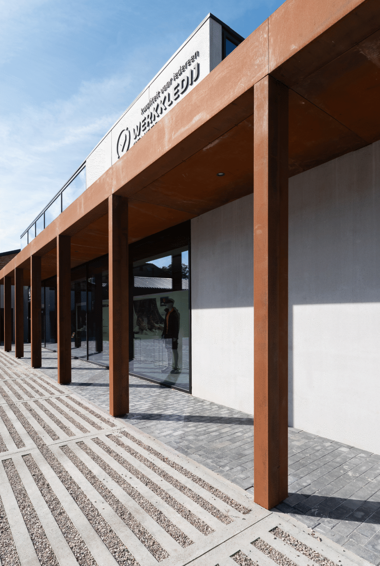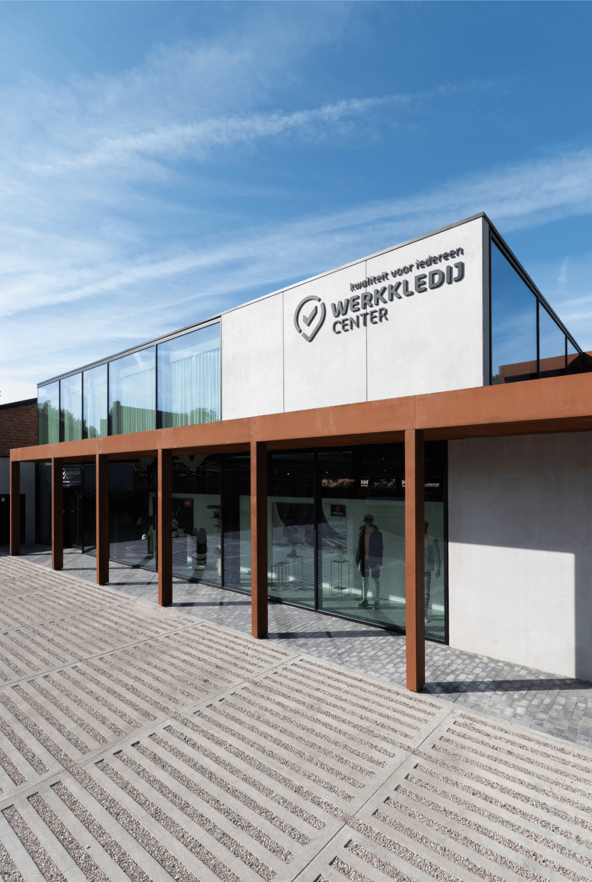 Moderne veranda en ramen met zwarte screens voor bedrijf Werkkledij Center in Waregem.
