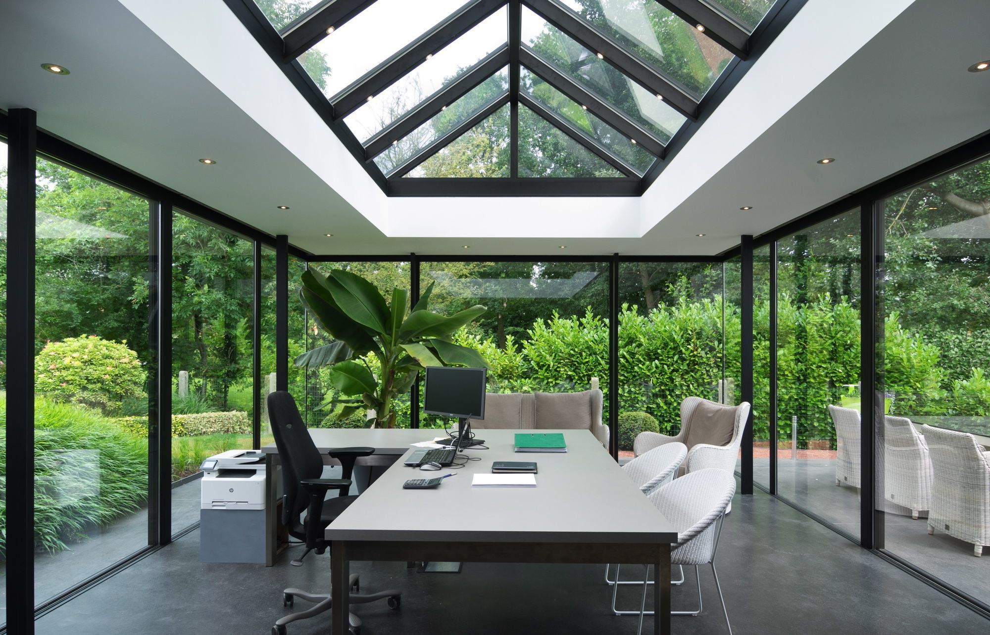 - Een tuinkantoor van aluminium en glas oogt zeer modern en laat extra veel licht binnen.